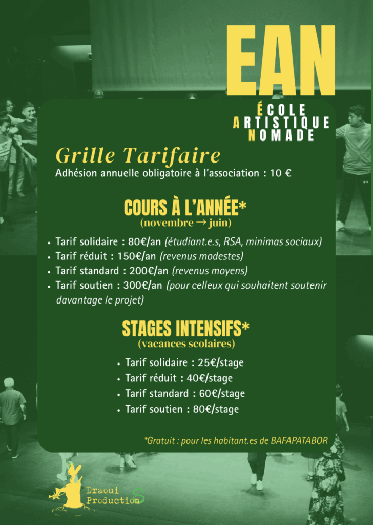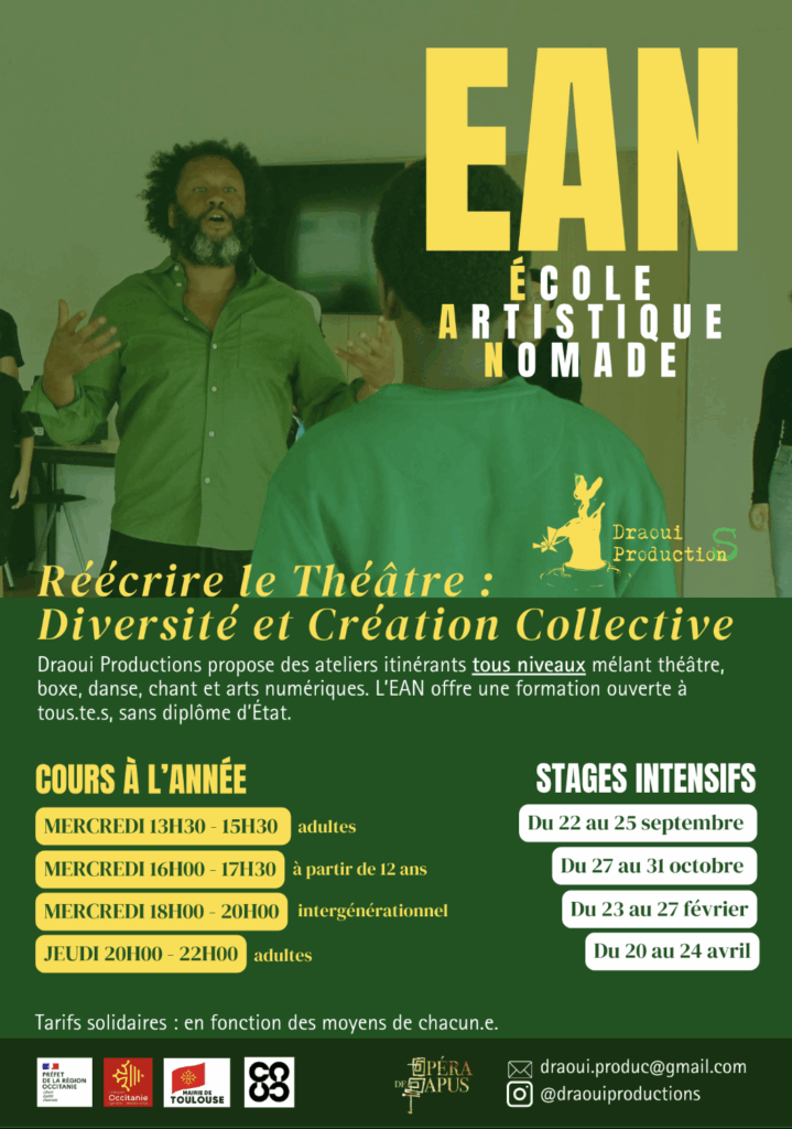 L’EAN (École Artistique Nomade) c’est une branche de la Compagnie Draoui Productions qui propose des ateliers itinérants tous niveaux mêlant théâtre, boxe, danse, chant et arts numériques.